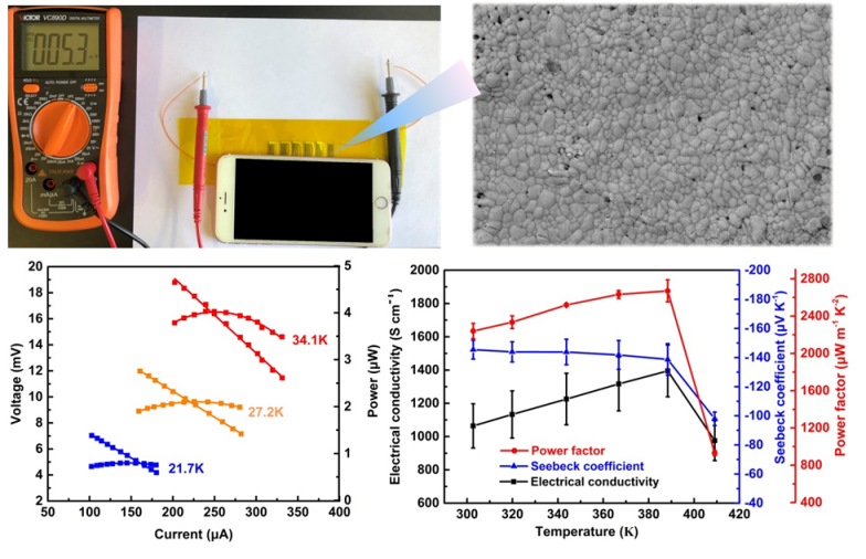 将复合膜组装成6个热电单臂柔性热电器件,在温差34.1 K时的最大功率密度高达37.6 W m-2。归一化的最大功率密度PDmax·l/ΔT2也高于已报道的柔性热电器件的值。将该6单臂器件放置于刚运行过游戏软件的手机下,手机温度与室温间9.4 K的温差下,该柔性热电器件产生了5.3 mV的电压。表明这种超高性能柔性热电薄膜在可穿戴设备中有潜在的应用。上述工作以 “Exceptionally high power factor Ag2Se/Se/polypyrrole composite films for flexible thermoelectric generators”为题发表于Advanced Functional Materials上。论文第一作者为伟德国际1946硕士生李雅婷,通讯作者为蔡克峰教授,共同通讯作者为南方科技大学何佳清教授。