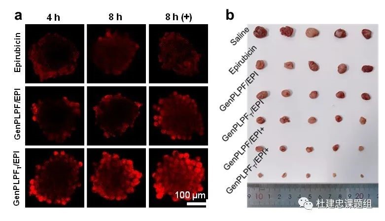 图2:(a)体外三阴性乳腺癌模型模拟多肽纳米凝胶的渗透性能;(b)体内抗肿瘤效果。