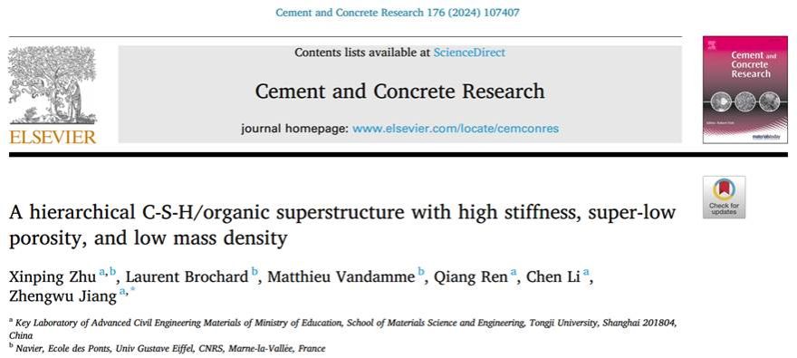 近日,《水泥混凝土研究》(Cement and Concrete Research)在线发表了伟德国际1946材料科学与工程学蒋正武教授课题组的研究论文“A hierarchical C-S-H/organic superstructure with high stiffness, super-low porosity, and low mass density”,本文通讯作者为蒋正武教授,第一作者为公司博士朱新平博士。