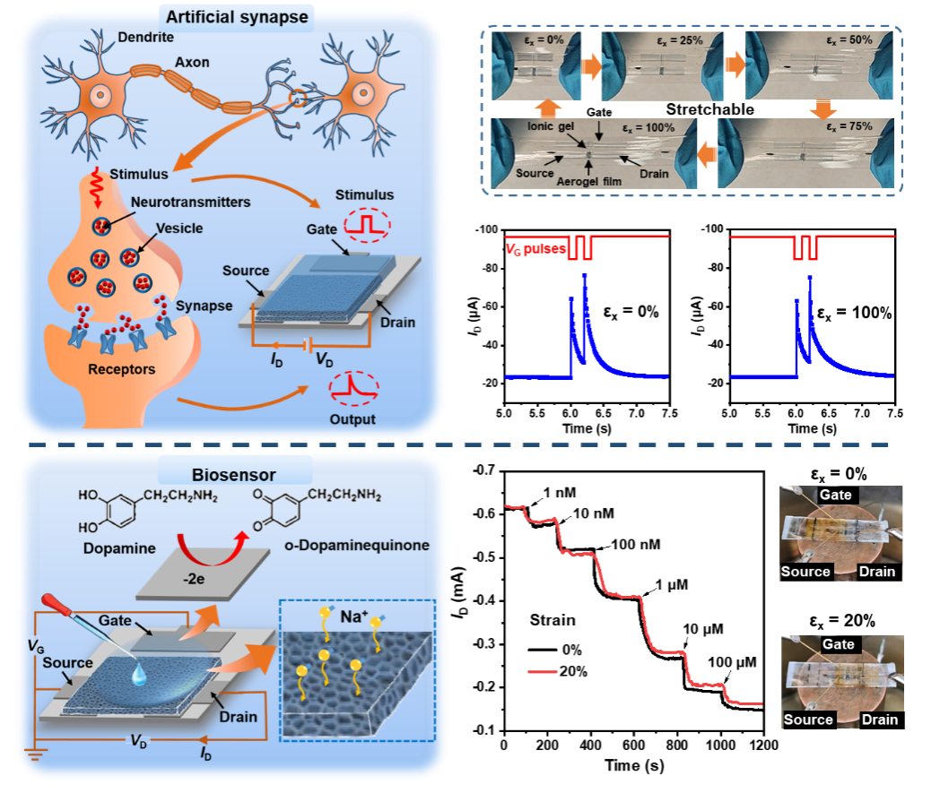 鉴于此,伟德国际1946祖国庆课题组采用单轴和双轴预拉伸策略,结合交联和模板法,构筑了折叠和内凹多孔结构高可拉伸半导体聚合物气凝胶薄膜及其电化学晶体管。所得半导体气凝胶电化学晶体管具有100%的可拉伸性、高拉伸稳定性、应变不敏感特性以及比致密薄膜器件更高的跨导,可用于可拉伸高灵敏度多巴胺生物传感器和可拉伸人工突触器件。该工作为开发高可拉伸半导体气凝胶薄膜及其柔性电子器件提供了一种通用策略。