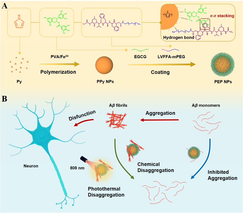 阿尔茨海默病(Alzheimer’s disease, AD)是一种中枢神经系统的退行性病变,是老年痴呆症最常见的形式。大脑中β-淀粉样蛋白(amyloid-β protein, Aβ)级联假说是其主要致病机制之一。近年来,在靶向消除Aβ斑块的临床药物研究方面取得了一定的进展。例如,第一款被美国食品和药物管理局完全批准的新药仑卡奈单抗(Lecanemab),能够降低患者大脑淀粉样蛋白沉积的程度。然而,这些临床药物大多通过免疫疗法清除患者Aβ斑块,其临床疗效有限且伴随着较大的副作用。因此,如何有效抑制Aβ的聚集并解离已经聚集的Aβ斑块,是AD治疗领域的一个关键科学问题。