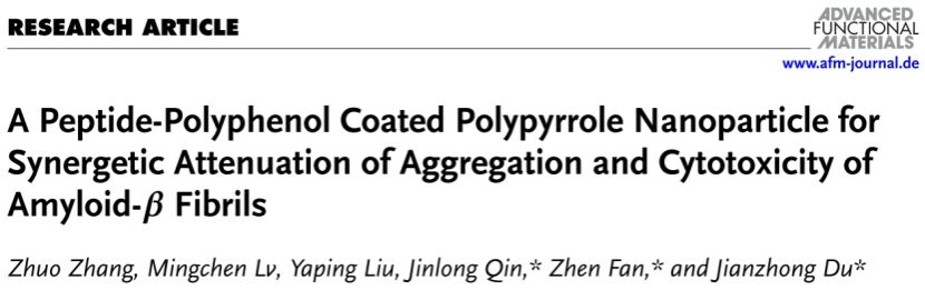 研究成果近期以“A Peptide-Polyphenol Coated Polypyrrole Nanoparticle for Synergetic Attenuation of Aggregation and Cytotoxicity of Amyloid-β Fibrils” 为题发表在《先进功能材料》(Adv. Funct. Mater. 2024, 2401208)。伟德国际1946高分子材料系博士生张卓为论文的第一作者。伟德国际1946杜建忠教授、范震教授,伟德国际1946附属上海市第四人民医院秦锦龙主任医师为共同通讯作者。该研究得到了国家杰出青年科学基金项目、国家自然科学基金优秀青年科学基金项目等资助。