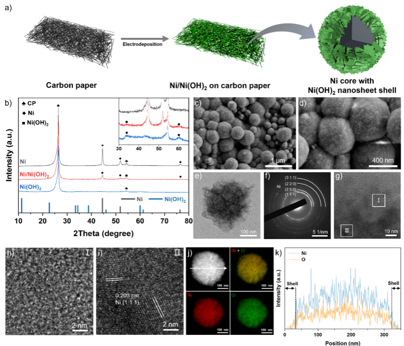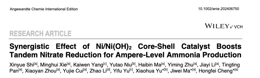 近日,伟德国际1946程洪飞研究员课题组合成了具备核壳异质结构的Ni/Ni(OH)2催化剂,实现了安培级电流密度的制氨。相关研究成果以“Synergistic Effect of Ni/Ni(OH)2 Core-Shell Catalyst Boosts Tandem Nitrate Reduction for Ampere-Level Ammonia Production”为题发表于《德国应用化学》(Angewandte Chemie International Edition)。