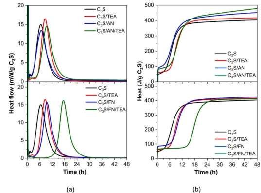 研究发现,尽管快速形成的AFt能够为硬化水泥石提供一定的早期强度,但C3S的加速水化和快速形成的C-S-H喷射混凝土早期强度的主要来源同时,研究进一步讨论了水泥浆液相离子种类、浓度和状态对水泥水化过程的影响。在离子状态方面,与自由离子相比,络合离子会增加TEA在水泥颗粒表面的吸附量,进而阻碍后续的水化过程,因此络合离子会引起更为显著的对硅相反应的抑制效果。在离子种类的影响方面,与铁离子络合的TEA的吸附量高于与铝酸根离子络合的TEA,因而对C3S水化产生了更强的延缓作用。