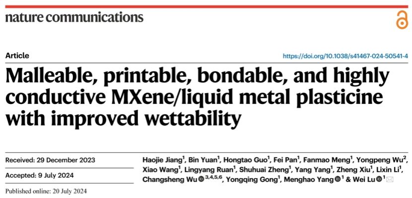 720日,《自然·通讯》(Nature Communications)在线发表了伟德国际1946陆伟教授团队及其合作者的研究论文“Malleable, Printable, Bondable, and Highly Conductive MXene/Liquid Metal Plasticine with Improved Wettability” 该论文提出了一种溶剂辅助分散(SAD)方法,利用流体和液态金属的变形特性来制造可延展的MXene/LM(MLM)复合材料,材料表现出优异的电磁屏蔽、传感、电热等性能。此外,材料可电子3D打印的特性也显示了其在集成电路领域中的应用潜力。