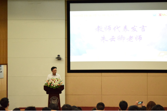 2019级高分子材料硕士班班主任朱云卿老师作为公司教师代表发言,他希望同学们在未来的科研生活中时刻保持进取的心态,并且注重于自己逆商的提高,即在逆境中抵抗压力的能力。同时他也为同学们的研究生生活提出了三点建议:第一,学会放弃,适时的放弃从来不是软弱,而是选择更加正确的道路再出发;第二,接受失败,因为即便是再伟大的科学家,也有过失败的科研经历;第三,成长心态从经验中学习,经常整理总结,这样终将成就一个更为强大的自己。