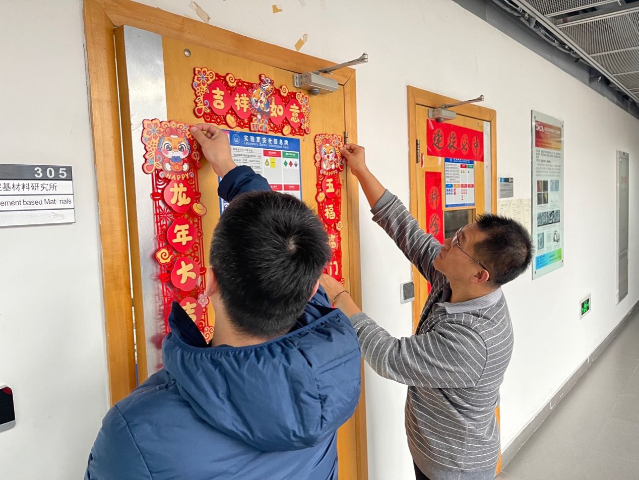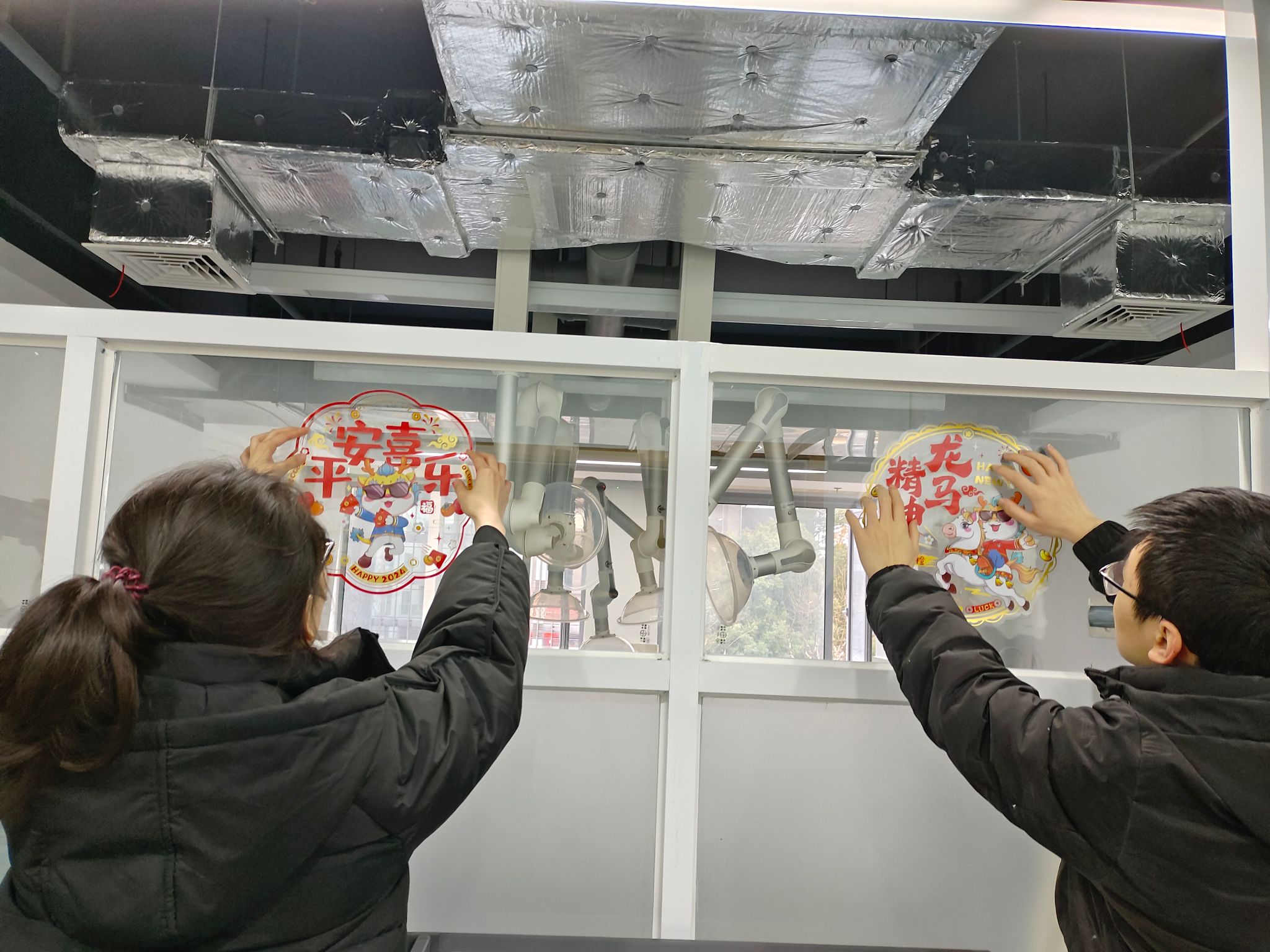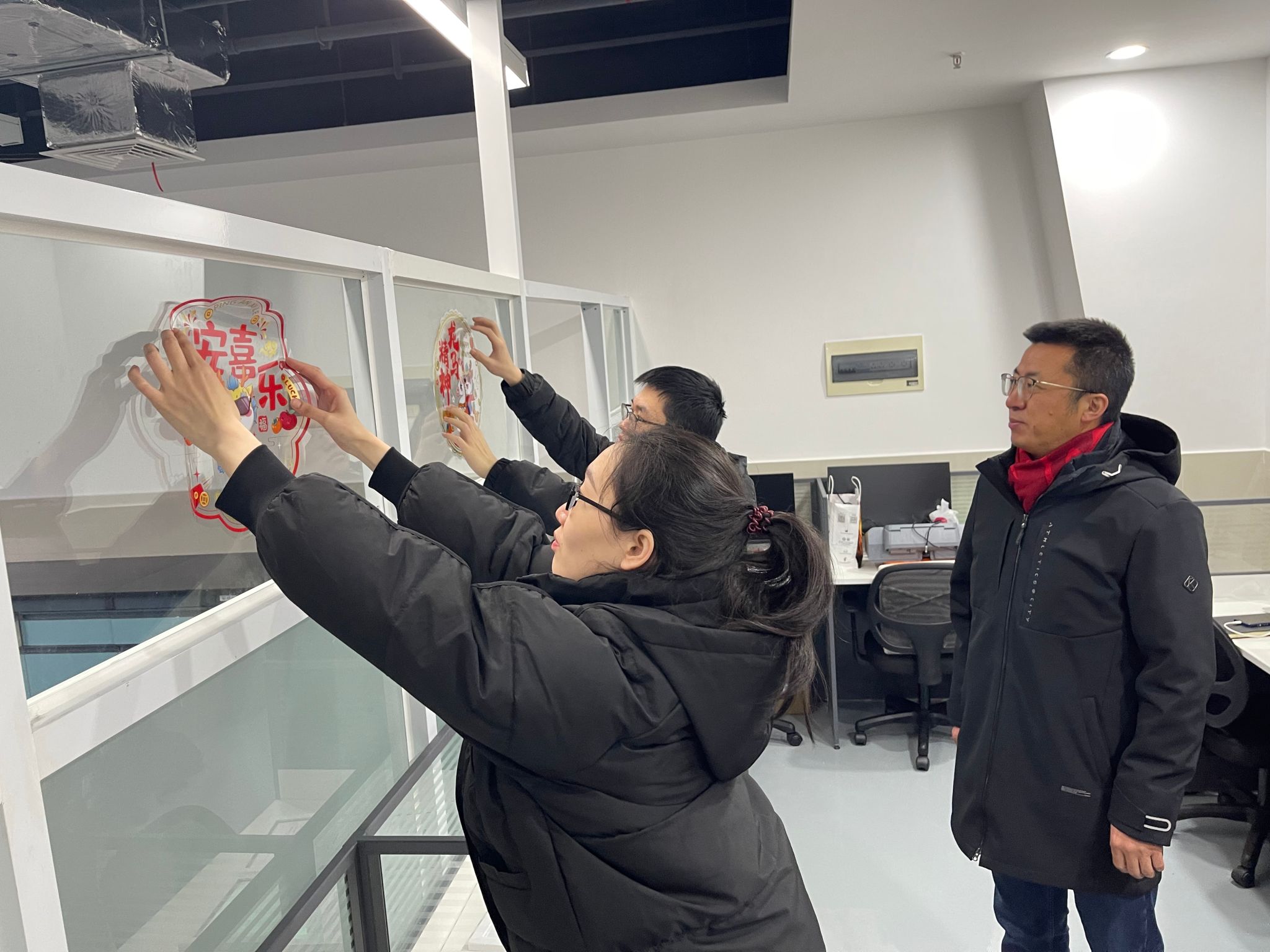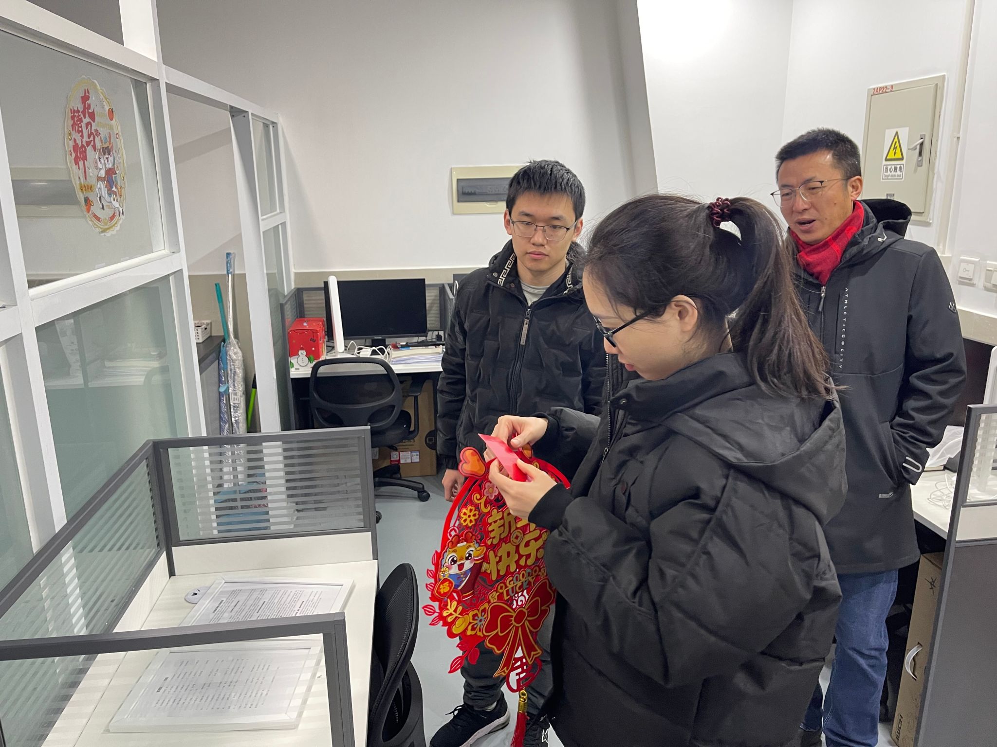 旨在为寒假坚持奋斗的每一位学子送达浓浓的关爱,2月1日,经理许维、党委副书记梁春江以及员工工作办公室老师一同走访实验室,看望并慰问了在校为科研拼搏的员工,通过亲切深入的互动交流,老师们全面了解员工寒假期间留校的原因或离校较晚的员工日程安排,询问了近期的学习、科研情况与生活需求,表示公司为留校学子开通科研测试绿色通道。同时叮嘱同学们寒假期间要注意劳逸结合,保重身体,遇到困难及时与公司的老师们联系,公司会尽全力帮助同学们解决。最后公司老师与同学们一起用活泼萌趣的龙年窗花、对联装点实验室,为大家送上了温馨的新春祝福,令莘莘学子感受到“材料大家庭”的温暖。