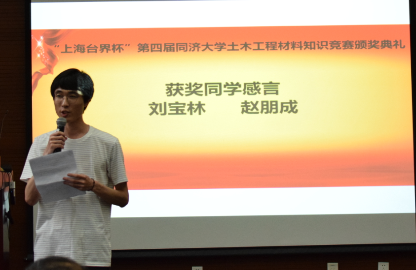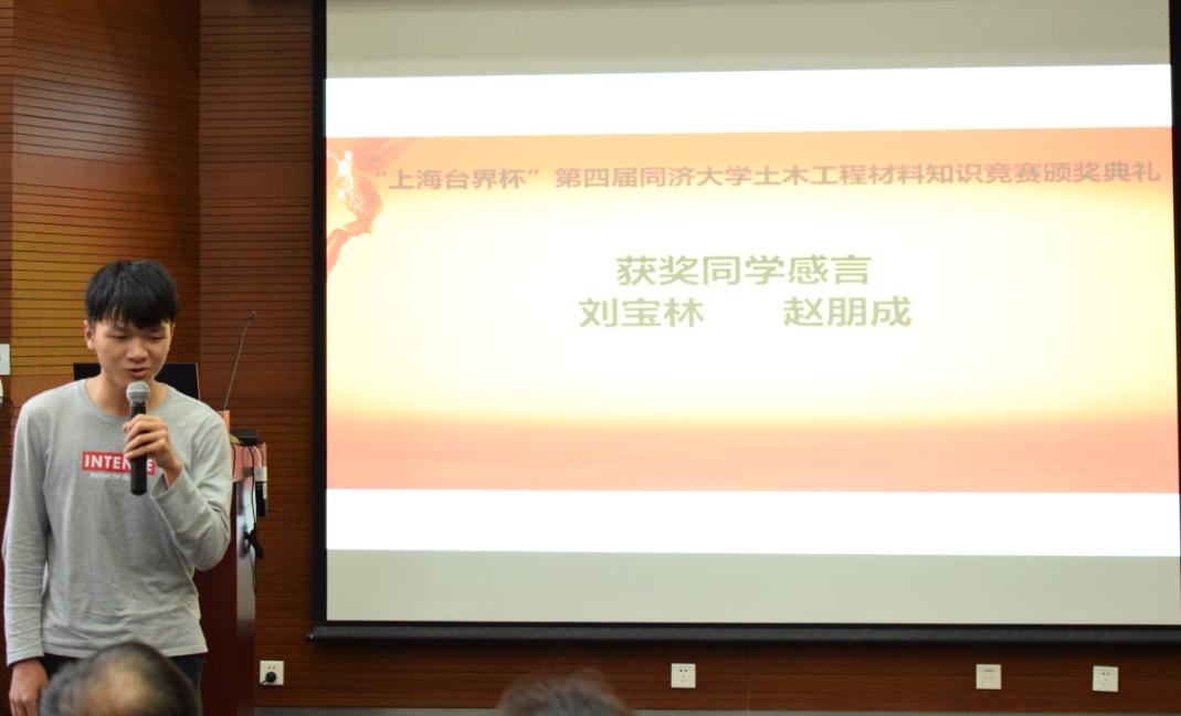 一等奖获得者刘宝林和赵朋成两位同学分别发表了获奖感言。他们均对竞赛主办方和协办方表示由衷感谢,认为土木工程材料系倡议发起的土木工程材料知识竞赛,对于在读老员工们来说,是每年热切期待的一项赛事,可以帮助同学们找到努力的方向,了解并深入学习一门专业知识并进行认真思考。赵朋成同学说:“参加这次比赛,有助于我们夯实专业基础,建立完善的知识体系,使我们在面临实际问题并想方设法解决问题的过程中加深对土木工程材料的认识。因此我特别感谢主办方和赞助方!”他还说:“当代青年要有激情和力量。一代人有一代人的使命,一代人有一代人的担当。中华民族站起来的近代史,是用血泪书写的斗争史;中华民族富起来的现代史,是用汗水书写的奋斗史。而我们这一代的使命是让我们的民族强起来,我想,我们的历史是用智慧书写的历史,因为这个时代的命门是科技。而不论在哪个历史时期,员工时代总是最富有激情、最富有创造力的时期。恰同学少年,风华正茂,望吾辈能求真学问,练真本领,心中有阳光,脚下有力量。”