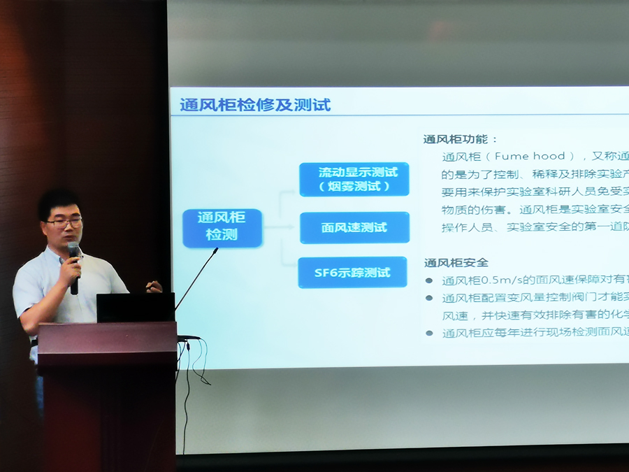 培训开始,姚经理首先针对近期全国高校实验室安全管理现状进行了简要总结,强调了加强实验室安全管理的重要性与紧迫性。随后,上海埃松技术总监夏本明先生分别从高校实验室现状、实验室通风柜及其他通风安全设备的原理与设计、通风橱及气瓶的安全使用与注意事项、仪器试剂的安全使用与存放、危化品的管理与处理、用电用水及使用习惯等多个方面与现场师生做了解读与分享,配合各种事故案例与实验室安全操作警示片等方式强调了实验室安全操作的重要性及不良处理的后果。引导员工养成良好的安全习惯,关注实验室安全、认知危险、增强自我保护意识和安全意识,学会避开实验不合理操作带来的危害,倡导师生共同创建安全、和谐的实验室环境。
