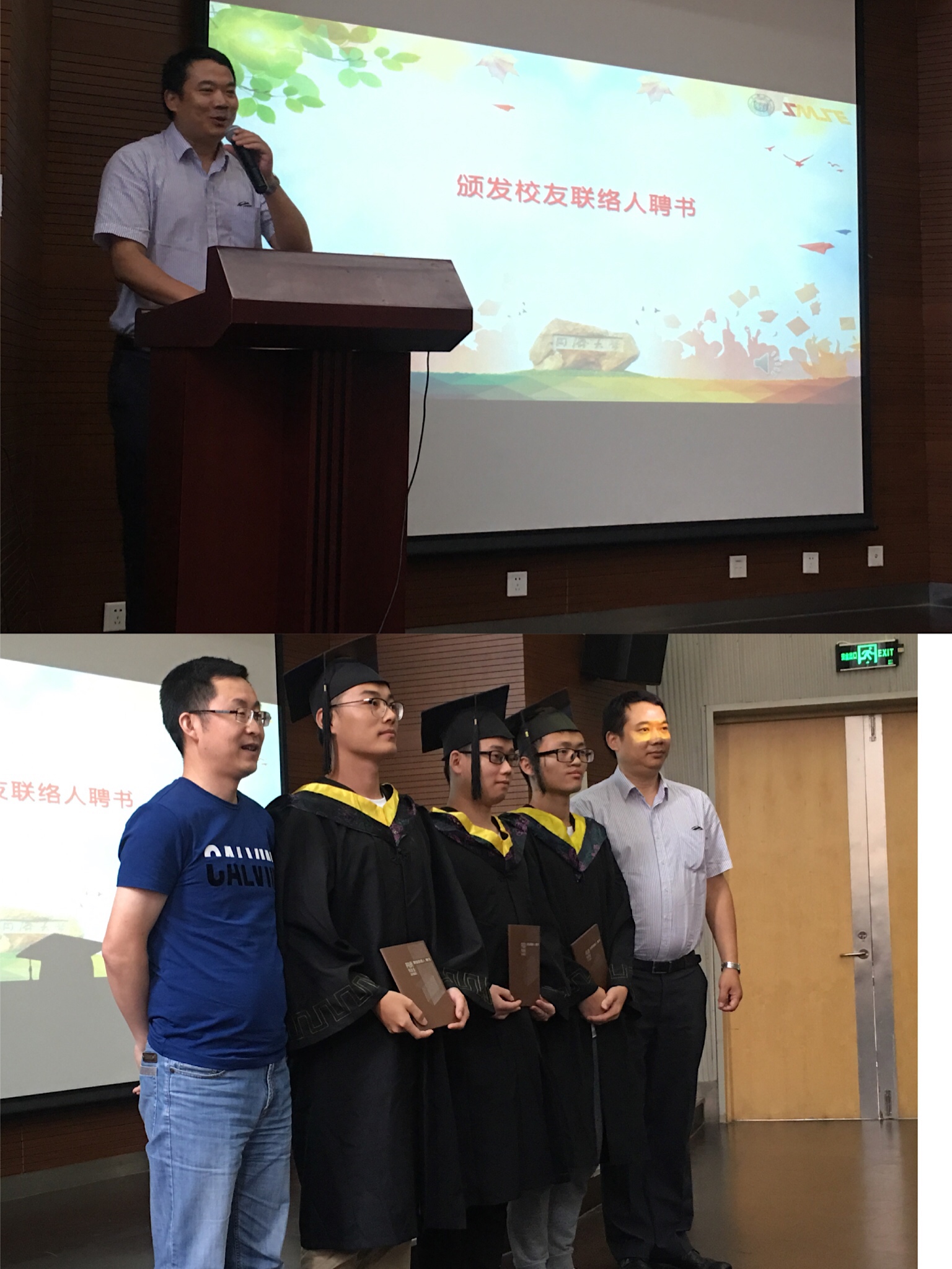 公司外联部主任张永明老师宣读了2019届本科生员工联系人名单,并与徐凯学长一起,向员工联系人颁发证书。