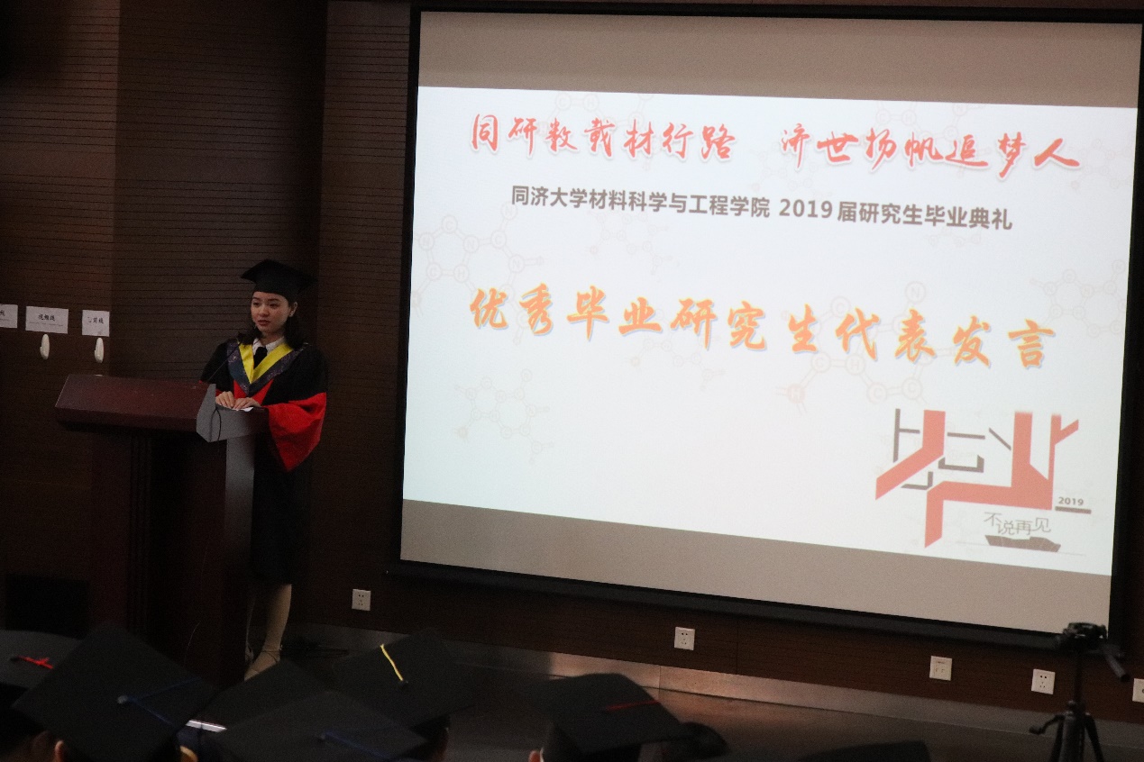 2019年上海市优秀毕业研究生林思琪博士代表全体毕业生发言,她首先回忆起自己第一次来到伟德国际1946与导师见面的场景,谈及自己曾经在是否投身博士研究生这个领域而踌躇不定,然而最终在导师孜孜不倦追求科学真理的探究中,坚定选择了走入这条充满挑战却又突破自我的道路。在博士期间,她取得了丰硕的科研成果,却仍只谦虚的称自己为“一位在学术道路上多走了几步的普通人”。林思琪谈到,作为一个毕业生,最想要做的,就是为我们国家和社会的材料未来发展贡献自己的全部力量,以此回报培养母校和恩师,祝福母校能够在未来的发展当中越来越好。