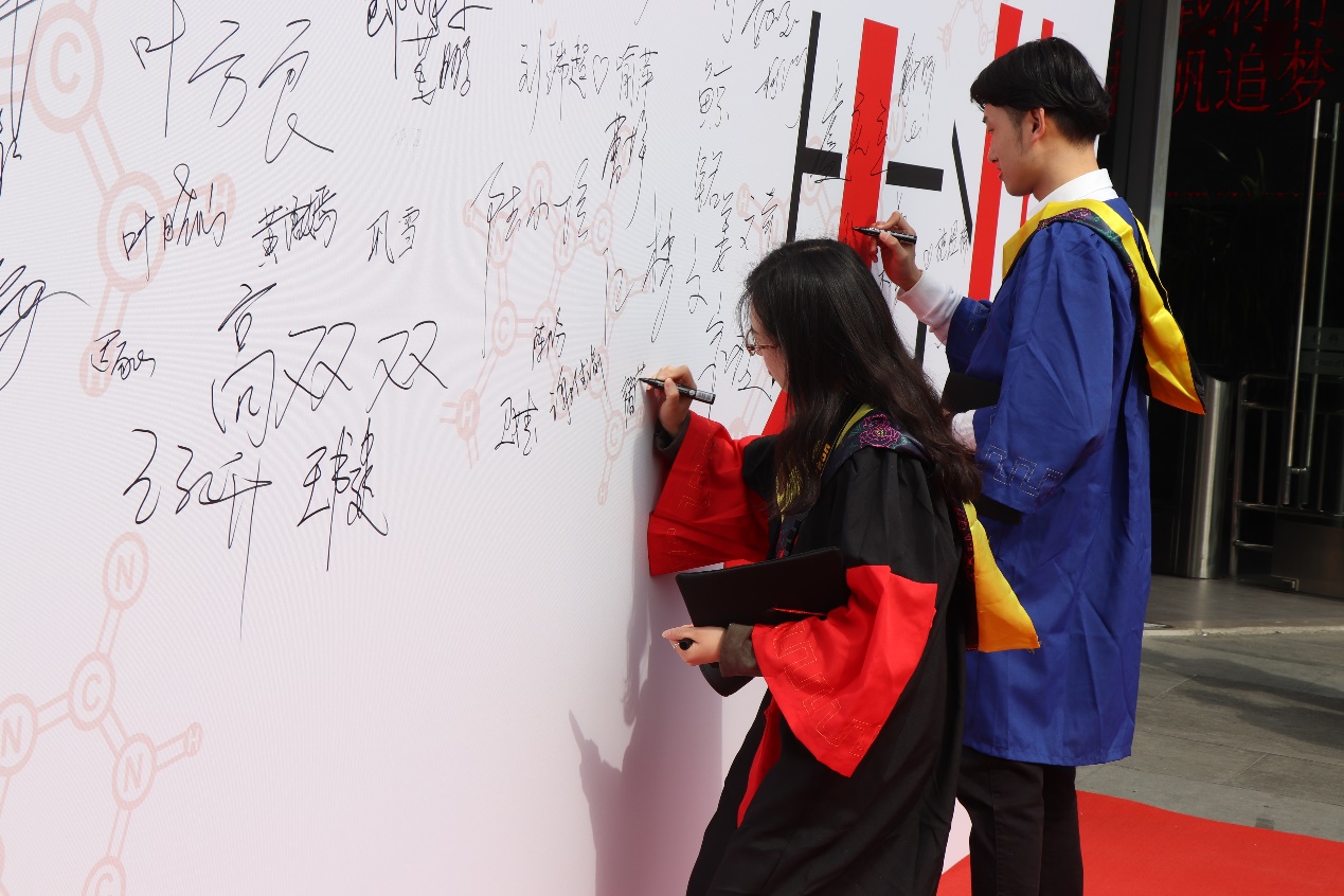 典礼前,德才馆门前的红毯与签名墙,无不代表者母校对于毕业生的不舍依恋毕业生的不舍与依恋;报告厅中,同学们携手同窗同门,抑或爱人父母,志得意满地前行。大家也纷纷在签名墙上写下自己的名字,还有对公司以及老师的殷殷祝福。