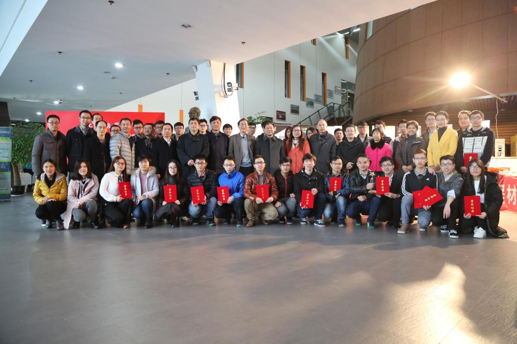 会场外阴云散去,雨势渐小;会场内讨论热烈,有声有色,这是11点的德才馆,真可谓“谈笑有鸿儒,往来无白丁”。不久后评分结束,主持人做了简短评议,然后在激昂的拉德茨基进行曲中宣布了获奖结果:一等奖的桂冠由“材料之光”摘得,实至名归;二等奖属于地聚物书桌摆件系列和彩色透水混凝土两组。公司党委书记王中平副教授等领导及来宾亲自为获奖队伍颁奖并合影。