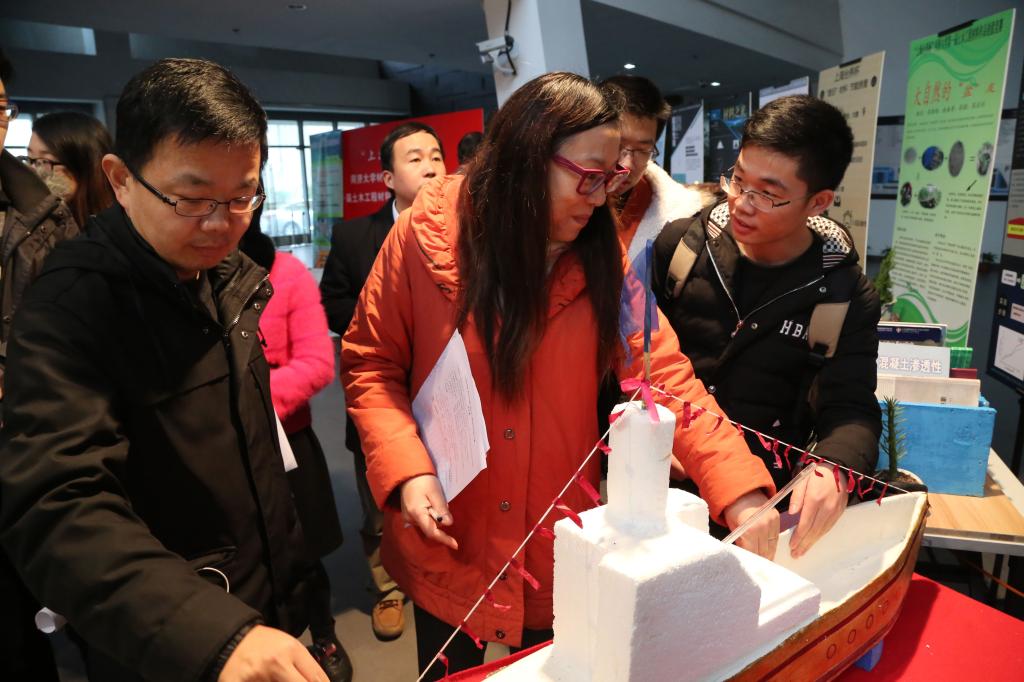 若将作品介绍比作精致的开胃小菜,那之后的问答环节就无疑是精神视觉双重意义上的饕餮盛宴:参赛组分三部分与评委们一同进入展区,组员们向评委们近距离展示作品细节,评委们也自由与各参赛队员详细交流,包括作品实用性、美观性,环保节能性,制作流程和参赛感受。参赛同学们谈到作品的优势时气定神闲,成竹在胸,而谈到作品的不足时同样直言不讳,落落大方,其间同学们所有表现都将成为评委们的评分依据。待所有介绍交流完毕,评委随即对作品、展板、讲演都细致公正地打出分数。比赛现场观众们和评委们的讨论声不绝于耳。