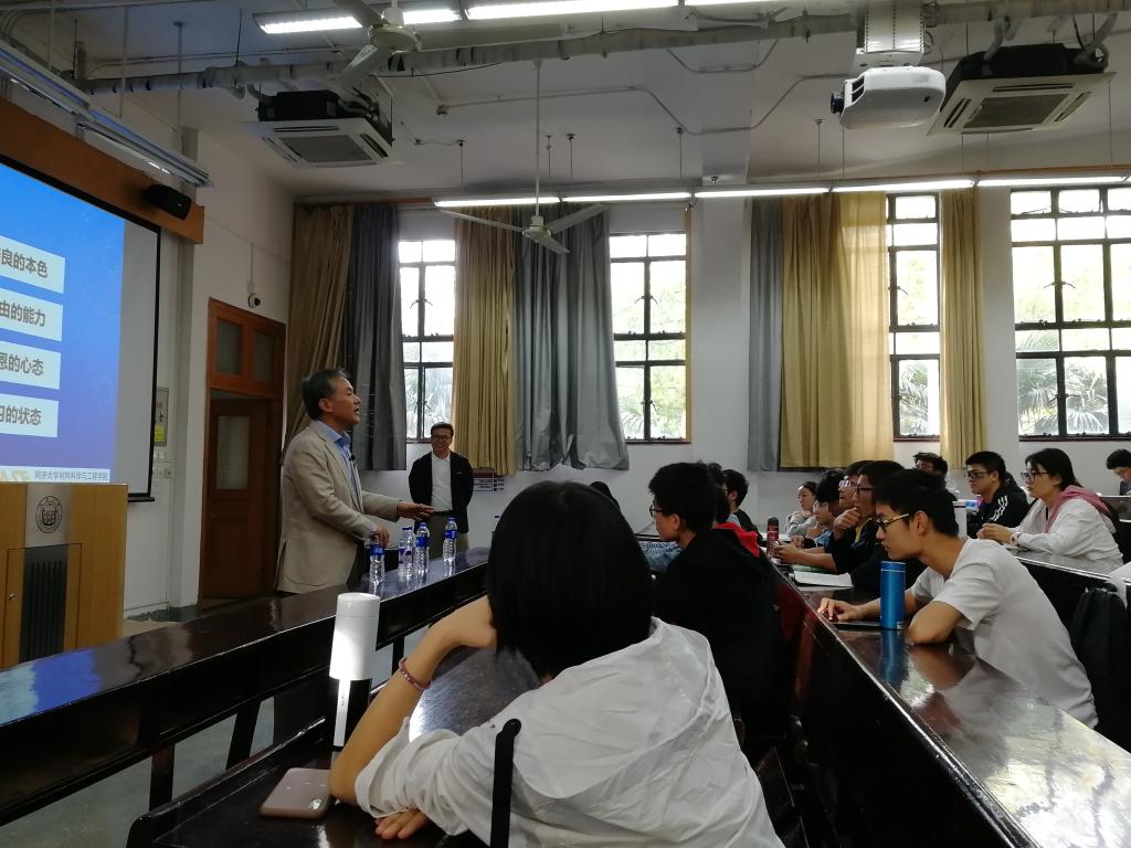 讲座中武文光员工谈到了材料的应用及发展,并结合自身成长,主要从“适应、学习、交友、管理、思考 “等方面说出自己对于老员工活和人生的感悟,并劝学子珍惜大学时光。