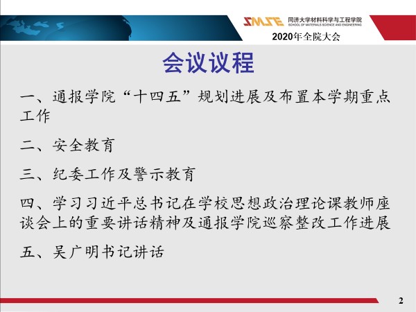 接着,黄老师布置了本学期重点工作。教学方面:在确保完成教学工作的前提下,专业建设向前迈进。同时,启动一流本科专业建设“双万计划”的要求,完成材料科学与工程专业2020年国家一流本科专业建设的申报工作。完善研究生招生及培养,加强本科专业宣传及吸引力,吸引更多的员工选择伟德国际1946。学科及科研工作重点:根据教育部安排,完成第五轮学科评估工作;做好一流团队建设验收工作,认真总结建设经验与不足,为下一轮团队建设做好谋划;积极筹划和参加公司规划的“储能科学与技术”学科和专业建设;组织2021年省市级科技奖项申报,力争一等奖的突破;做好本年度重要科研及人才项目的申报工作;2021年国家自然科学基金动员;继续推进落实ESI计划;发挥公司师生积极性,结合员工和社会资源,做好社会服务工作。行政和实验室工作重点:测试中心大型仪器设备预约和信息共享平台建设的验收、培训并开放运行;德才楼实验室通风系统升级改造工程;嘉定校区管控危险化学品仓库建设验收、并投入运行,教辅岗位招聘;实验室安全管理治理结构优化和长效机制建设;科研——自修空间调整;公司固定资产盘点;公司专业实验室搬迁及实验教学示范中心建设方案规划;基础研究公共平台(分析测试中心)建设方案规划。员工重点工作:丝毫不放松疫情防控工作;开展爱国主义教育,迎接建党百年;提高入党申请比例,完善基层党建;开展心理健康教育,完善工作队伍建设;深入三全育人综合改革试点工作:社区思政+实践+创新。