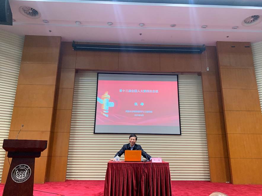 会上,张雄教授以他本人参加会议的亲身经历、亲身感受,对2021年全国两会精神进行了传达,着重介绍了政府工作报告、全国人大常委会工作报告中的热议词,《国民经济和社会发展第十四个五年规划和2035年远景目标纲要》,以及大会通过全国人民代表大会关于完善香港特别行政区选举制度的决定等情况。此外,还分享了会场内外的一些精彩花絮。张雄教授表示,宣传好全国两会精神,对坚定师生信心、激发奋斗精神具有重要意义。与会教师纷纷表示,要通过多种形式,深入领会两会精神实质和内涵,深刻领会习近平总书记重要讲话精神,深刻领会今年政府工作报告关于经济社会发展、高等教育的重要部署,以优异成绩庆祝中国共产党成立一百周年。