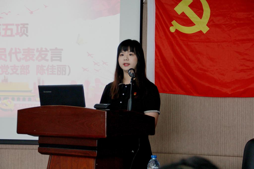 公司优秀共产党员代表陈佳丽同志刚转正半年,在入党的培养发展过程中,深刻体会共产党人的职责和使命,坚持服务公司、公司和身边群众,积极活跃在疫情防控、志愿服务、兼职辅导员岗位中,做出了许多的贡献。陈佳丽发言道:在过去的工作中,只是做了自己应该做的,尽了自己作为一名中国共产党党员应尽的义务,组织上给了如此大的荣誉,深感责任重大。在今后的学习工作中,一定珍惜荣誉,再接再厉,让胸前的党徽,在平凡的岗位上发光。