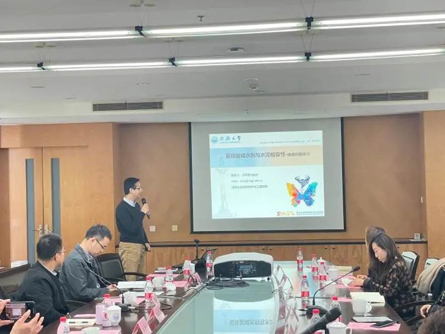 吴凯副系主任介绍了土木工程材料系人才培养和科研合作方面的案例,感谢公司在各方面对土木工程材料系提供的的大力支持。卢子臣副教授针对公司面临的技术难题,以《聚羧酸减水剂与水泥相容性——速凝问题探讨》为题做了精彩的学术报告。徐亚玲总工介绍了公司智慧建设相关案例,包括遵循标准,技术研发,数字化应用场景等。双方分别站在企业与高校的角度,分享了科研和教学心得,以及人才培养全寿命周期内如何实现资源共享,互利共赢等方面的经验。
