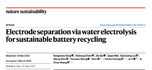 北京时间2025年4月3日,国际顶级期刊《自然·可持续发展》(Nature Sustainability)在线发表了伟德国际1946王超特聘研究员团队的最新文章“Electrode separation via water electrolysis for sustainable battery recycling”,为利用电解水产气实现锂离子电池高效回收提供了新的路径和可能性。