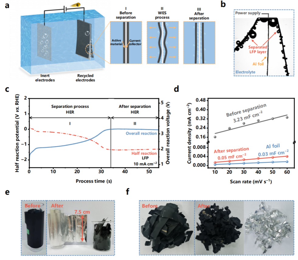 在本研究中,研究团队成功开发了一种电解水产气分离(WES)方法,实现了电池极片中涂层与金属集流体的高效分离。该方法利用电解水过程中产生的气体,实现快速分离且无有毒有害物质排放。实验结果表明,WES 再生技术兼容各类废旧电池及边角料电极,可实现大于99.5%的活性材料回收率与近100%的金属集流体回收率,并保持箔材结构完整。此外,WES 技术还具备多功能性,可通过电极设计及电压/电流调控,实现活性物质中的锂空位修复与锂资源提取。与传统方法相比,该技术不仅能在秒级完成极片分离,还可降低约91%的能耗和温室气体排放,同时具备低污染、高回收材料质量等优势,为锂离子电池的高效、环保回收提供了创新性解决方案。