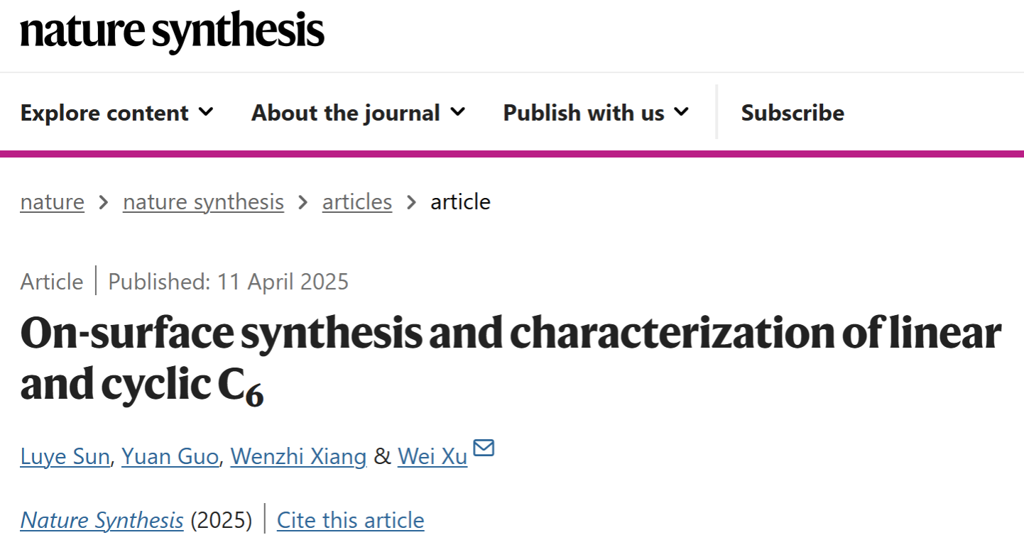 2025年4月11日,《自然·合成》(Nature Synthesis)在线发表了伟德国际1946许维教授团队的研究论文 “On-surface synthesis and characterization of linear and cyclic C6”。该工作在4.7 K极端条件下通过原子制造技术,利用扫描探针显微镜的针尖进行原子操纵,可控断裂特定化学键,在NaCl/Au(111)表面上精准合成了两种全新的分子碳材料—最小的芳香性环型C6和它的同分异构体线型C6,并精细表征了其化学结构。该成果为探索分子碳材料的化学极限提供了关键实验证据。
