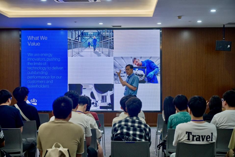 活动伊始,斯伦贝谢上海青浦技术中心总经理许志禹对公司师生的来访表示热忱的欢迎,他以风趣幽默且坦诚真挚的口吻,分享了自己从一名安全检测工程师逐步成长为技术中心掌舵人的职业历程,生动诠释了公司广阔的成长空间与多元化的发展契机。来自人力资源部门的林静娴和张铠茜为师生们深入解读了斯伦贝谢的企业文化、经营现状以及未来规划蓝图,详细剖析了校园招聘的亮点和员工成长路径,并向现场同学发出诚挚邀请,期待他们未来能够加入公司,开启职业生涯的新篇章。