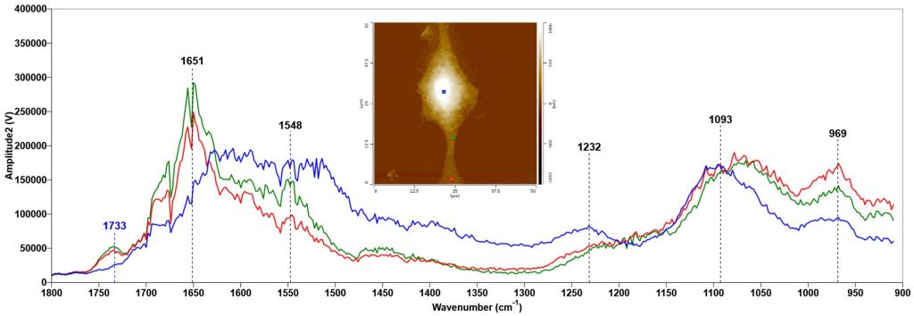 本作品利用基于扫描探针平台的纳米光热显微术和纳米力学显微术针对吞噬细胞两种不同的亚型(M0&M2)下的细胞内结构(形貌);弹性力学(杨氏模量)和化学成分(蛋白质)分布进行了表征研究。弹性模量成像清晰显示出M0和M2细胞内部的亚表面结构即类“蛋黄”结构(细胞核),其具有较小的弹性模量(暗蓝色)。随后利用纳米光热显微术针对M2细胞的内部化学成分进行了表征研究,发现其在1544cm-1附近存在独特的光热吸收,对应于蛋白质种的酰胺键,表面细胞内具有大量的蛋白,发现M2细胞两端“足部”与“蛋黄”结构种的化学成分存在显著差异。随后在1544cm-1波数下进行细胞的光热吸收成像。发现“蛋黄”结构中存在密集的蛋白分布,细胞“足部”足部蛋白含量较少,这与弹性力学成像结果相对应。该表征手段可以实现细胞亚表面结构的辨别以及细胞内纳米尺度化学成分的分辨与成像。