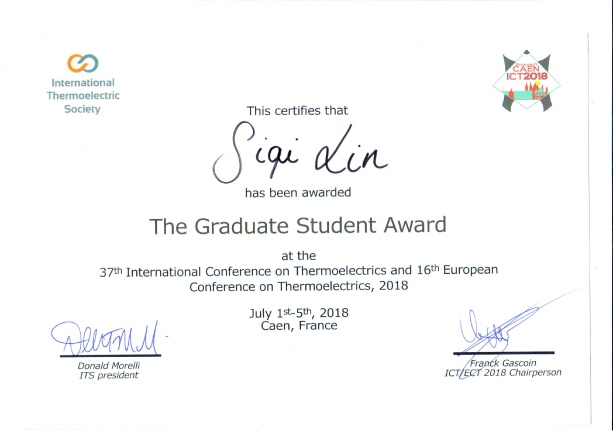 2019届直博研究生林思琪也将自己青春献给了科研,做人之不愿做,行人之不敢行,立足基础,终于厚积薄发。林思琪在实验室从小事做起,也坚信所有科学问题都源于最简的开始。她搜集了现有报道的所有热电材料的热导率及声子结构的信息,并发现低声速、低声学截止频率等有效实现低晶格热导率的指导思路,以此开发了晶格热导率低如木头的硫银锗矿材料。五年的博士生涯,她发表SCI论文31篇热电论文,第一/通讯作者论文7篇,其中包括Cell姊妹刊和Nature子刊2篇。鉴于在热电研究的成果和贡献,被国际热电学会授予2018 ITS Graduate Student(每年遴选2名博士生)和ICT Best Poster等国际荣誉奖项。而今,博士毕业的她选择了在伟德国际1946继续自己的科研生涯。