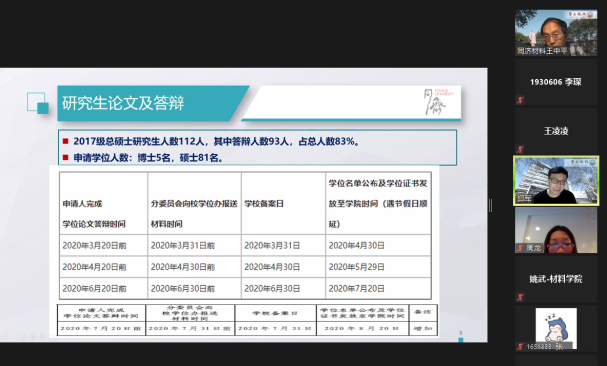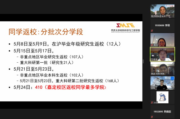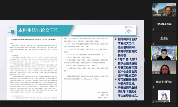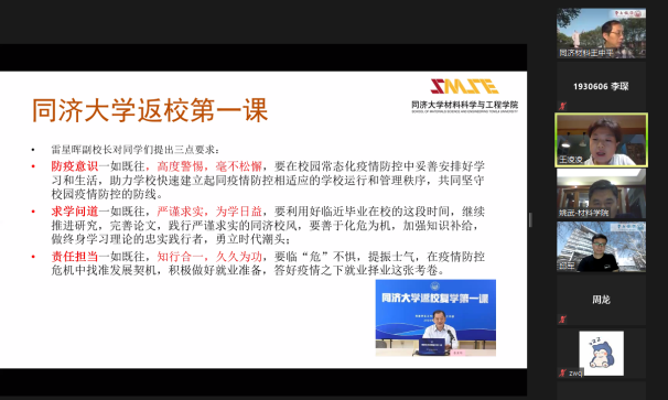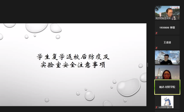 5月24日晚19时30分,在三个批次共三百余位本研同学顺利复学返校后,为保障师生校园健康平安,严格规范公司公司相关规定,伟德国际1946组织返校学子在线上开展了公司复学第一课,公司党委书记王中平、党委副书记王凌凌、副经理邱军和姚武出席,分别为同学们讲述了防疫期间的日常管理、毕业进展安排以及实验室安全等具体要求。公司320余位本研返校学子在线聆听。