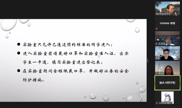 王凌凌老师与同学们重新强调了伟德国际1946返校复学第一课的相关内容,并详细介绍了公司防疫工作的管理规定,特别提到同学们防疫意识不放松,每日继续按时信息上报,校园封闭管理实行外出请假报备制度,平时社区、实验室以及公司图书馆等公共场合不聚集,非必要不串门等。公司各楼宇严格登记,按时间要求进出,务必遵守疫情下实验室安全管理规定。同时也应调整学习状态,尽快投入毕业及科研相关工作。此外王凌凌书记还提醒同学积极调节自己的心理状态,合理疏导负面情绪,遇到困难及时与导师和相关负责老师沟通。