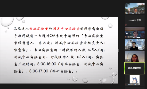 姚武老师为返校员工强调了近期进入实验室的注意事项,要求员工不聚集,在实验区域也保证安全距离,尤其要注意手部清洁。如需开展实验需通过OA系统预约,提前准备好一卡通和实验室准入证,无论是科研实验室抑或是专业实验室,都要遵循开放时间进行实验,同时实验室需定期加以消毒,按规定认真完成自查。此外,校外人员访问实验室,比如进行设备安装调试的人员,需要以导师名义提前预约。