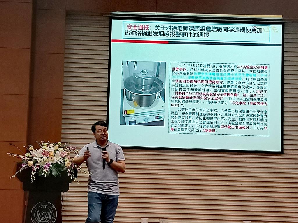 蒋正武老师首先强调了实验室安全的重要性,督促同学们在做实验前自我提问:“在实验前要形成认识:实验会产生什么样的反应,会有什么样的风险?”对现场的2021级研究生新生现场考察安全隐患问题。蒋老师并以近年来沪内外各高校的典型实验室安全事故为例,强调了作为一名即将踏入实验室的研究生,应当强化安全意识,熟悉安全规定;掌握应对措施,明确安全责任;树立隐患就是事故概念,警惕安全隐患。